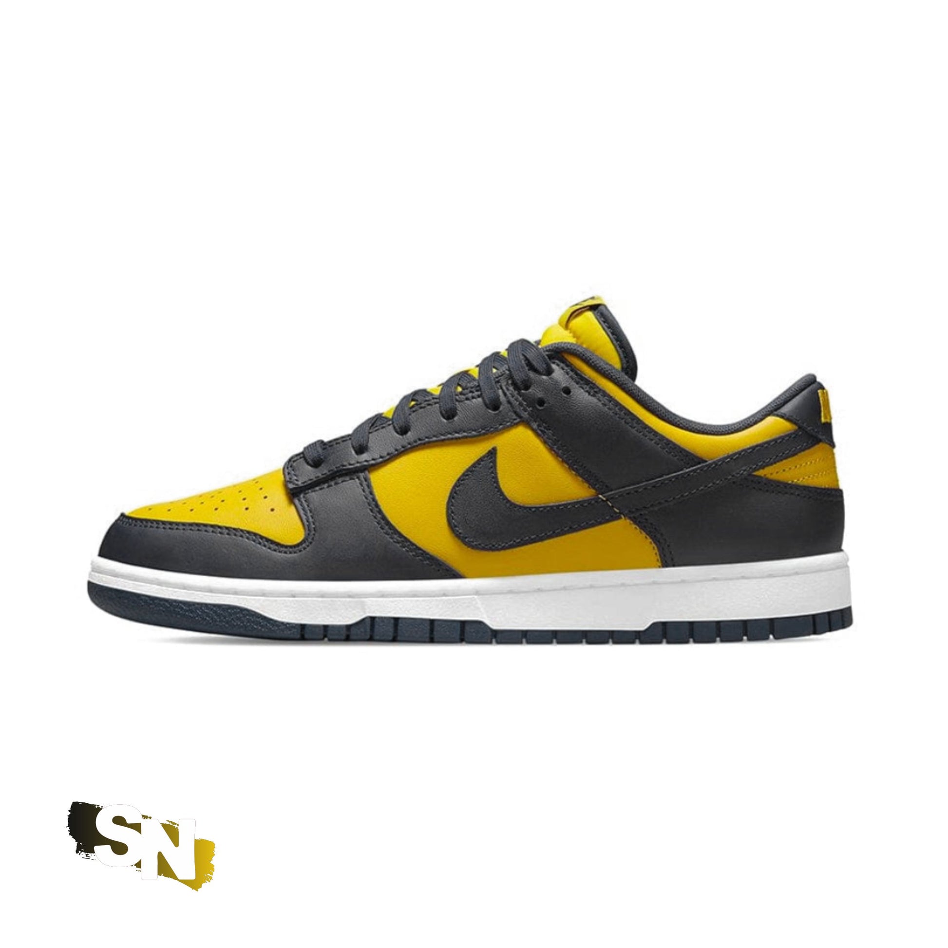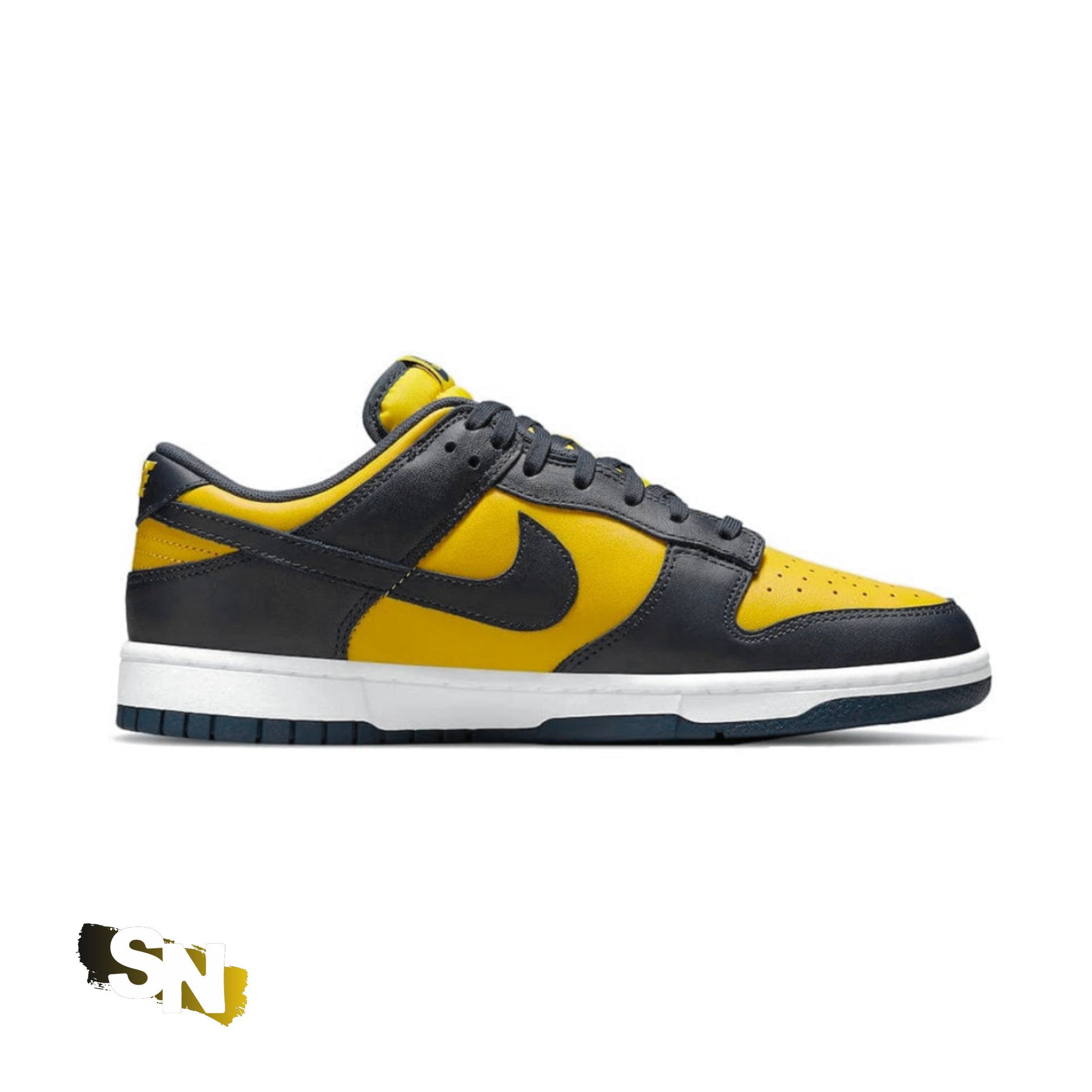 The upper of the Nike Dunk Low Michigan is made of Varsity Maize leather with Midnight Navy overlays and Swoosh logos. A woven Nike label stitched to the tongue and "NIKE" text embroidered on the heel complete the design.